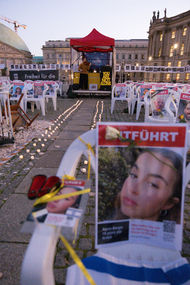 Der Käfig steht als eindringliches Symbol ihrer Gefangenschaft — ein stummer, aber kraftvoller Schrei nach Freiheit. Er spiegelt die Isolation, die Entbehrungen und die Qualen wider, die sie ertragen müssen, und fordert die Betrachter auf, sich an ihr Schicksal zu erinnern und sich für ihre Freilassung einzusetzen.