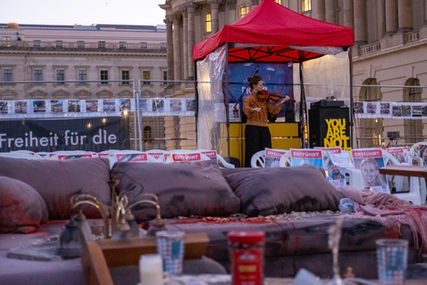 Mehrere Installationen auf dem Platz verdeutlichen die unerträgliche Situation der Geiseln.